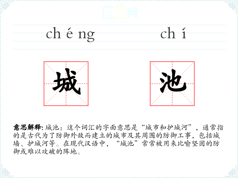 城池:这个词汇的字面意思是“城市和护城河”,通常指的是古代为了防御外敌而建立的城市及其周围的防御工事,包括城墙、护城河等。在现代汉语中,“城池”常常被用来比喻坚固的防御或难以攻破的阵地。