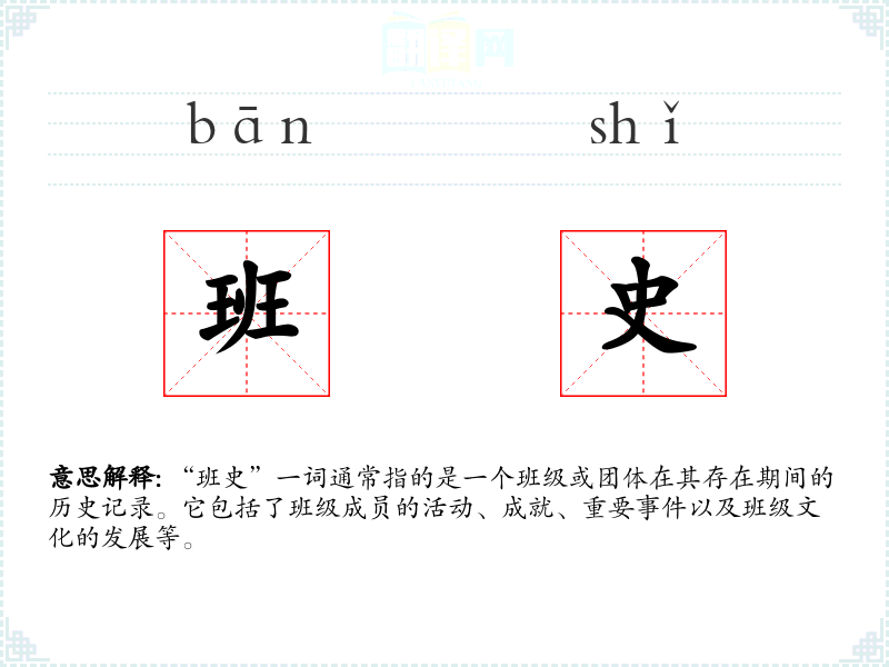 “班史”一词由“班”和“史”两个字组成。“班”指班级或团体,“史”指历史。这个词在中文教育领域中逐渐形成,用以特指班级的历史记录。