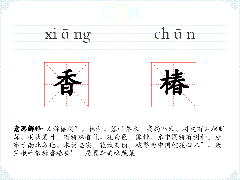 1.又称椿树”。楝科。落叶乔木,高约25米。树皮有片状脱落。羽状复叶,有特殊香气。花白色,像钟。系中国特有树种,分布于南北各地。木材坚实,花纹美丽,被誉为中国桃花心木”。嫩芽嫩叶俗称香椿头”。是夏季美味蔬菜。