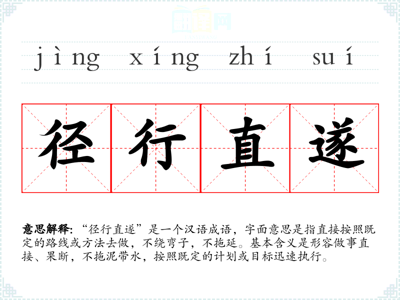 “径行直遂”是一个汉语成语,字面意思是指直接按照既定的路线或方法去做,不绕弯子,不拖延。基本含义是形容做事直接、果断,不拖泥带水,按照既定的计划或目标迅速执行。