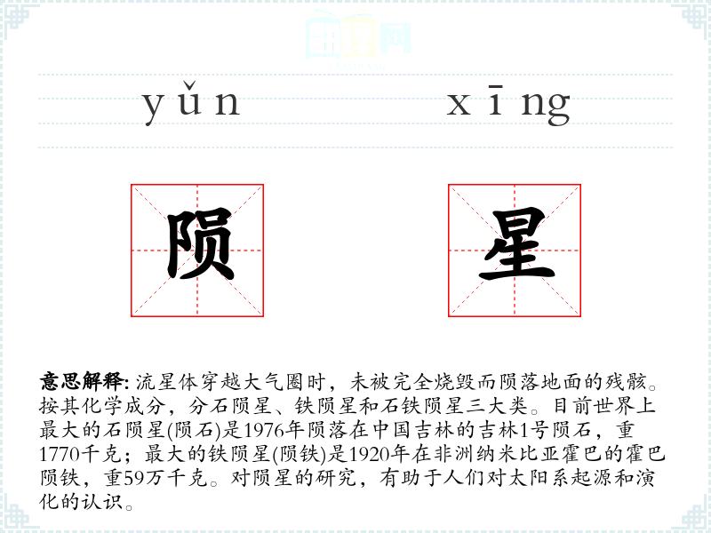 1.流星体穿越大气圈时,未被完全烧毁而陨落地面的残骸。按其化学成分,分石陨星、铁陨星和石铁陨星三大类。目前世界上最大的石陨星(陨石)是1976年陨落在中国吉林的吉林1号陨石,重1770千克;最大的铁陨星(陨铁)是1920年在非洲纳米比亚霍巴的霍巴陨铁,重59万千克。对陨星的研究,有助于人们对太阳系起源和演化的认识。
