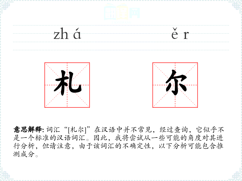 由于“札尔”不是一个标准的汉语词汇,我们无法给出确切的基本定义。它可能是某个方言词汇、外来词汇的音译,或者是某个特定领域的术语。