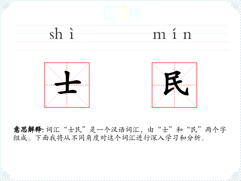 词汇“士民”是一个汉语词汇,由“士”和“民”两个字组成。下面我将从不同角度对这个词汇进行深入学*和分析。