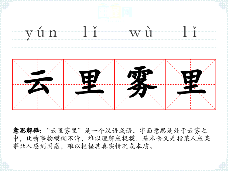 - 口语:在日常口语中,人们常用这个成语来形容某人说话或行为让人难以理解,如“他说的话云里雾里,我完全听不懂。”