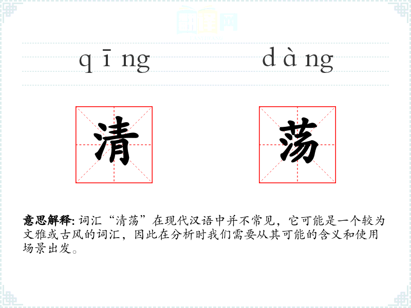 词汇“清荡”在现代汉语中并不常见,它可能是一个较为文雅或古风的词汇,因此在分析时我们需要从其可能的含义和使用场景出发。