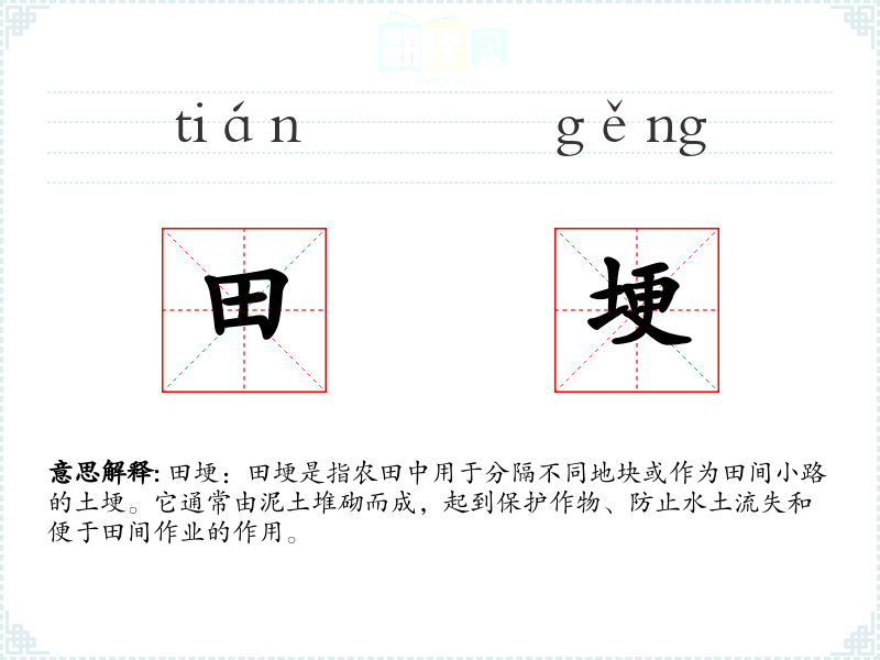 词源:田埂一词源自古代汉语,由“田”和“埂”两个字组成。其中,“田”指农田,“埂”指土埂。