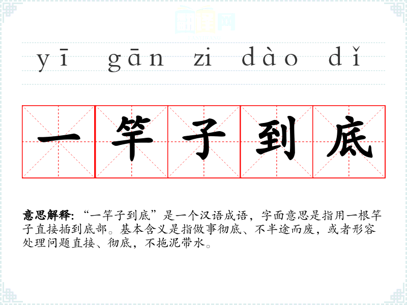 “一竿子到底”是一个汉语成语,字面意思是指用一根竿子直接插到底部。基本含义是指做事彻底、不半途而废,或者形容处理问题直接、彻底,不拖泥带水。