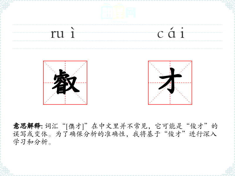 词汇“[儁才]”在中文里并不常见,它可能是“俊才”的误写或变体。为了确保分析的准确性,我将基于“俊才”进行深入学*和分析。