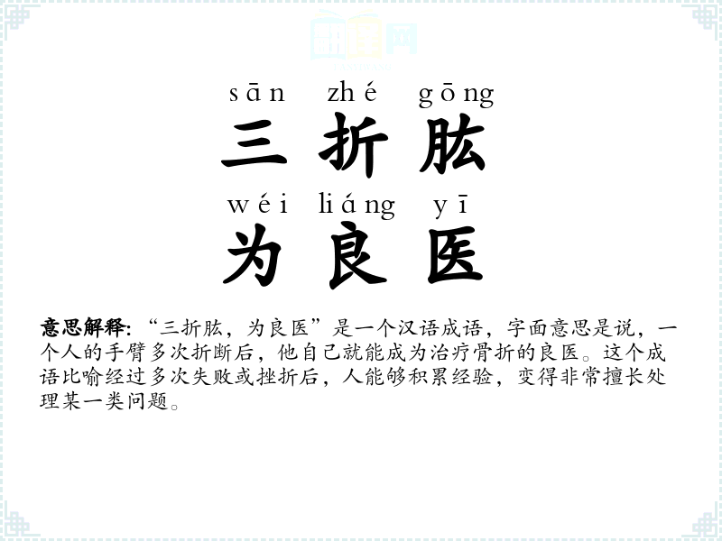 “三折肱,为良医”是一个汉语成语,字面意思是说,一个人的手臂多次折断后,他自己就能成为治疗骨折的良医。这个成语比喻经过多次失败或挫折后,人能够积累经验,变得非常擅长处理某一类问题。