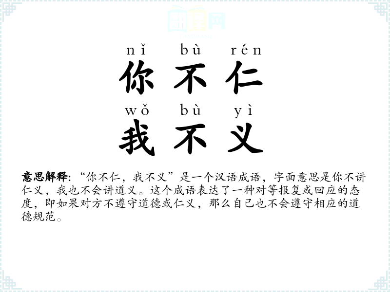 “你不仁,我不义”是一个汉语成语,字面意思是你不讲仁义,我也不会讲道义。这个成语表达了一种对等报复或回应的态度,即如果对方不遵守道德或仁义,那么自己也不会遵守相应的道德规范。
