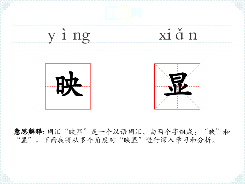 词汇“映显”是一个汉语词汇,由两个字组成:“映”和“显”。下面我将从多个角度对“映显”进行深入学*和分析。