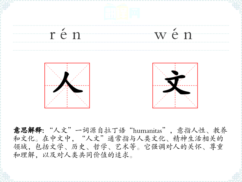 “人文”一词源自拉丁语“humanitas”,意指人性、教养和文化。在中文中,“人文”通常指与人类文化、精神生活相关的领域,包括文学、历史、哲学、艺术等。它强调对人的关怀、尊重和理解,以及对人类共同价值的追求。