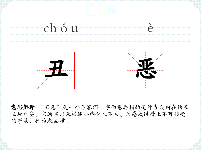 “丑恶”是一个形容词,字面意思指的是外表或内在的丑陋和恶劣。它通常用来描述那些令人不快、反感或道德上不可接受的事物、行为或品质。
