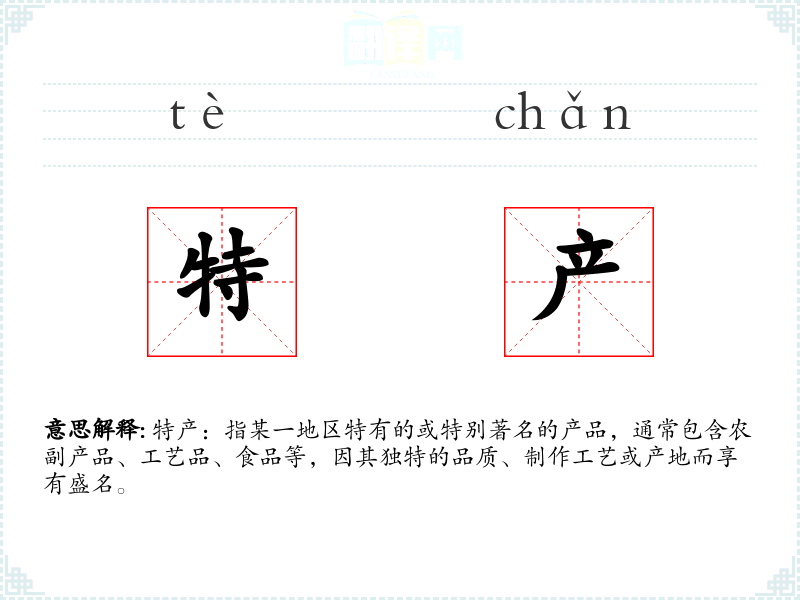 特产:指某一地区特有的或特别著名的产品,通常包含农副产品、工艺品、食品等,因其独特的品质、制作工艺或产地而享有盛名。