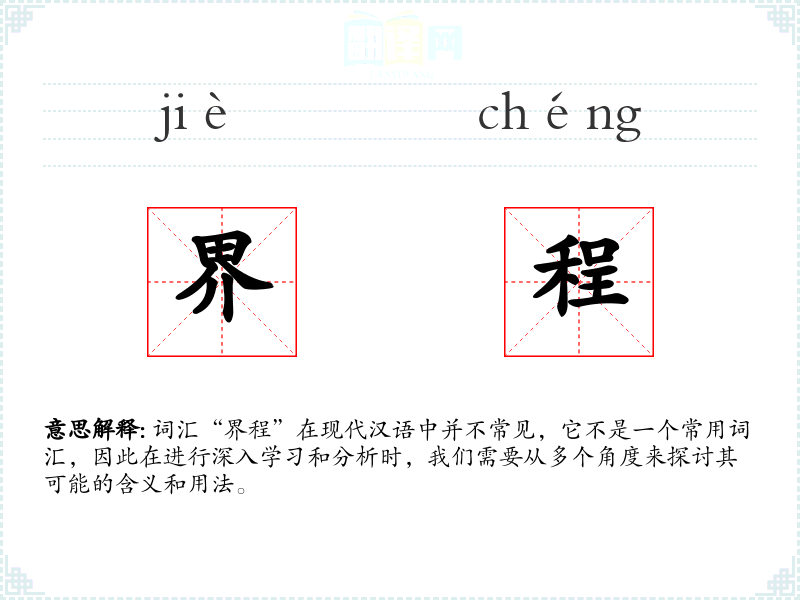 总的来说,“界程”这个词虽然不常见,但它提供了一个思考界限和程度的有趣视角。在语言学习和表达中,它可以作为一个富有想象力的词汇,用来描述那些超越常规界限的情境。