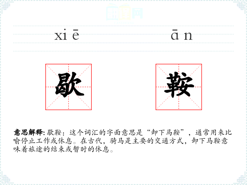 歇鞍:这个词汇的字面意思是“卸下马鞍”,通常用来比喻停止工作或休息。在古代,骑马是主要的交通方式,卸下马鞍意味着旅途的结束或暂时的休息。