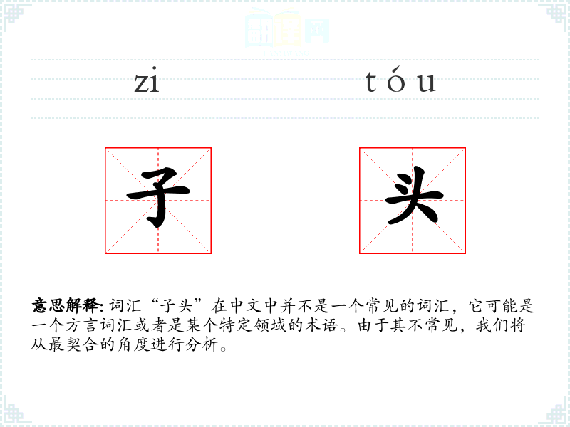 由于“子头”不是一个标准汉语词汇,它可能在某些方言中或者特定行业中有特定的含义。例如,在某些方言中,“子头”可能指的是小孩子的头部,或者在某些行业中,如木工或建筑,可能指的是较小的构件或部分的头部。