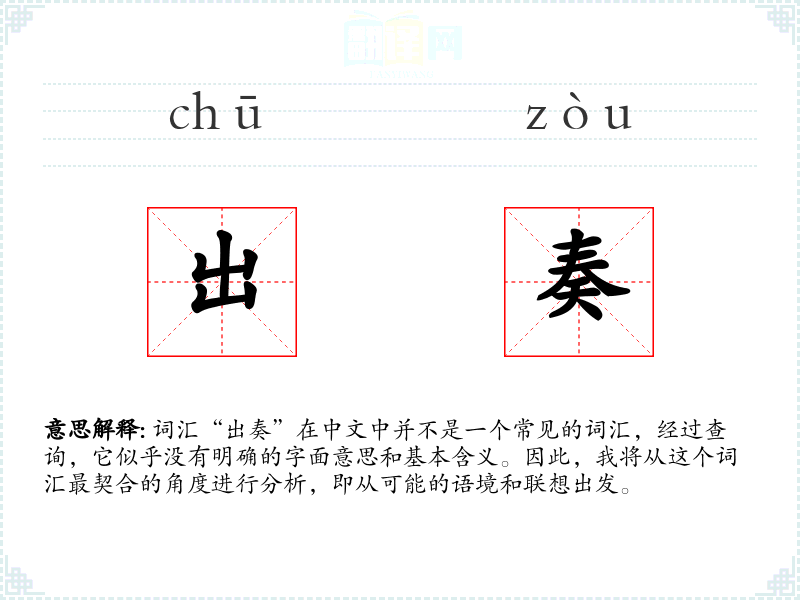 由于“出奏”不是一个标准词汇,我们无法给出一个确切的基本定义。它可能是由“出”和“奏”两个字组合而成的,但这样的组合在中文中并不常见,也没有明确的意义。