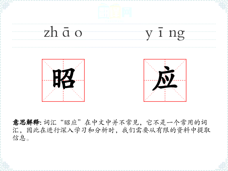 词汇“昭应”在中文中并不常见,它不是一个常用的词汇,因此在进行深入学*和分析时,我们需要从有限的资料中提取信息。