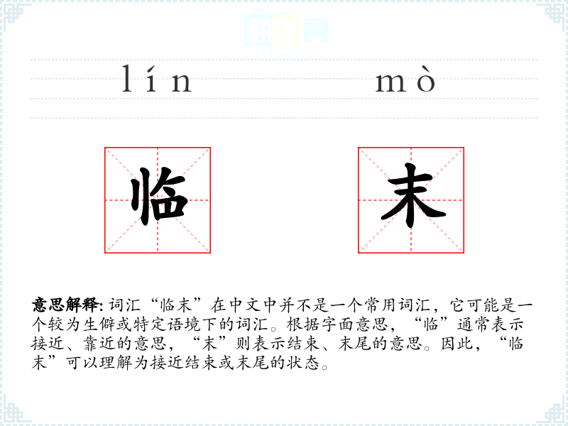 词汇“临末”在中文中并不是一个常用词汇,它可能是一个较为生僻或特定语境下的词汇。根据字面意思,“临”通常表示接近、靠近的意思,“末”则表示结束、末尾的意思。因此,“临末”可以理解为接近结束或末尾的状态。