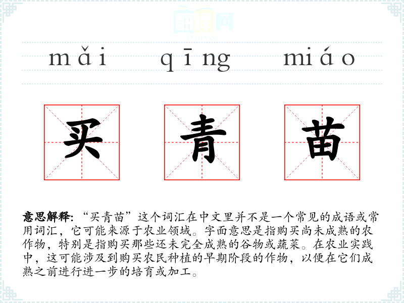 “买青苗”这个词汇在中文里并不是一个常见的成语或常用词汇,它可能来源于农业领域。字面意思是指购买尚未成熟的农作物,特别是指购买那些还未完全成熟的谷物或蔬菜。在农业实践中,这可能涉及到购买农民种植的早期阶段的作物,以便在它们成熟之前进行进一步的培育或加工。