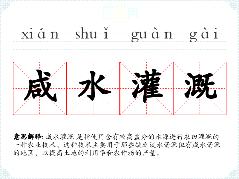 “咸水灌溉”一词直接来源于中文,其中“咸水”指含盐分较高的水,“灌溉”则是指给植物供水。随着全球水资源紧张问题的加剧,这个词在农业和环境科学领域的使用频率逐渐增加。