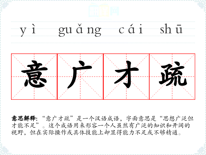 “意广才疏”是一个汉语成语,字面意思是“思想广泛但才能不足”。这个成语用来形容一个人虽然有广泛的知识和开阔的视野,但在实际操作或具体技能上却显得能力不足或不够精通。