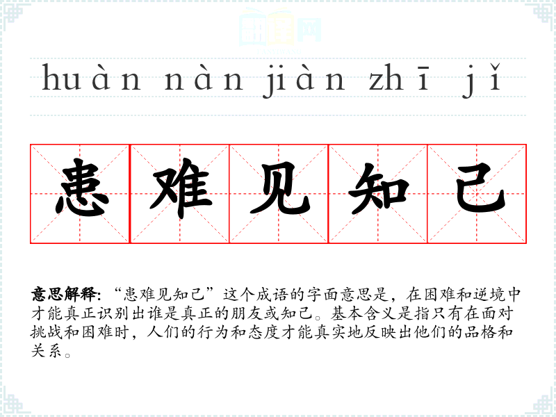 “患难见知己”这个成语的字面意思是,在困难和逆境中才能真正识别出谁是真正的朋友或知己。基本含义是指只有在面对挑战和困难时,人们的行为和态度才能真实地反映出他们的品格和关系。