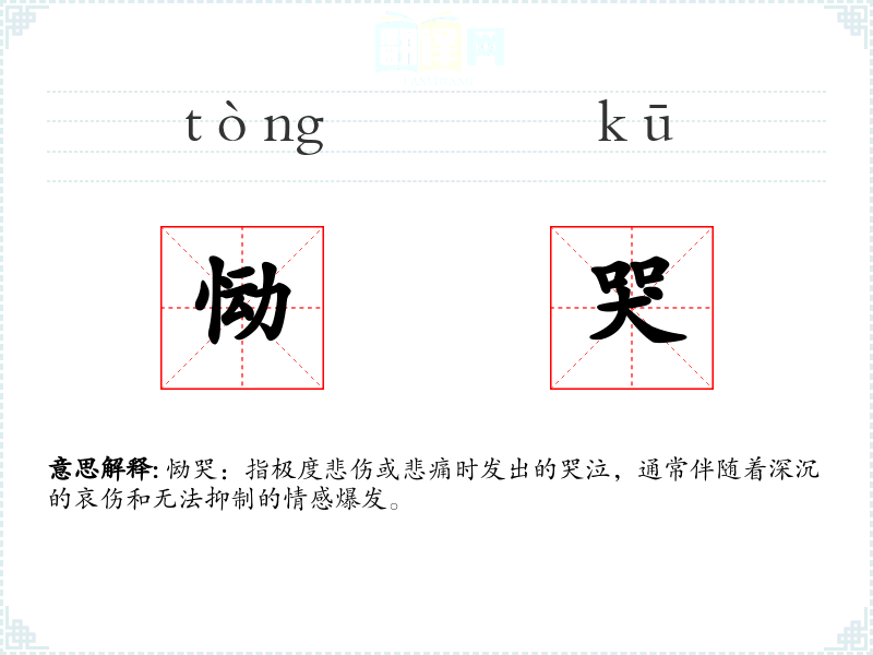 - 词源:恸哭一词源自古代汉语,由“恸”(极度悲伤)和“哭”(哭泣)组成。