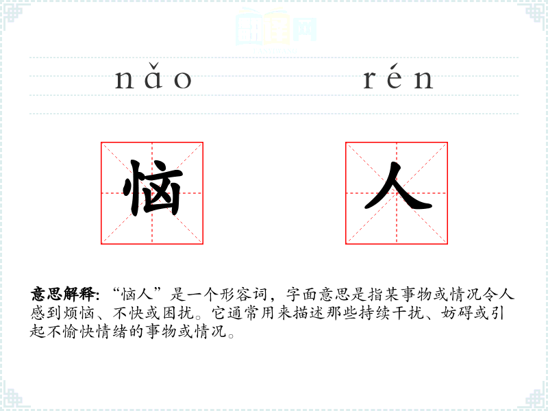 “恼人”是一个形容词,字面意思是指某事物或情况令人感到烦恼、不快或困扰。它通常用来描述那些持续干扰、妨碍或引起不愉快情绪的事物或情况。