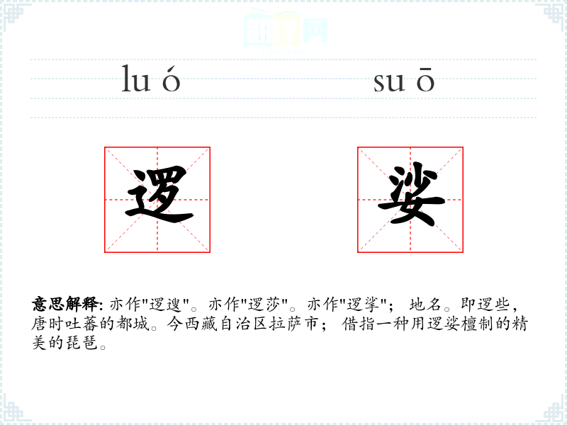 亦作"逻遚"。亦作"逻莎"。亦作"逻挲"; 地名。即逻些,唐时吐蕃的都城。今西藏自治区拉萨市; 借指一种用逻娑檀制的精美的琵琶。