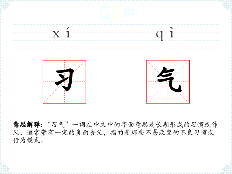 “气”一词在中文中的字面意思是长期形成的惯或作风,通常带有一定的负面含义,指的是那些不易改变的不良*惯或行为模式。