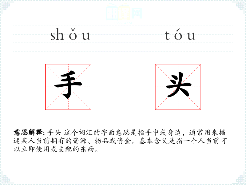 手头 这个词汇的字面意思是指手中或身边,通常用来描述某人当前拥有的资源、物品或资金。基本含义是指一个人当前可以立即使用或支配的东西。