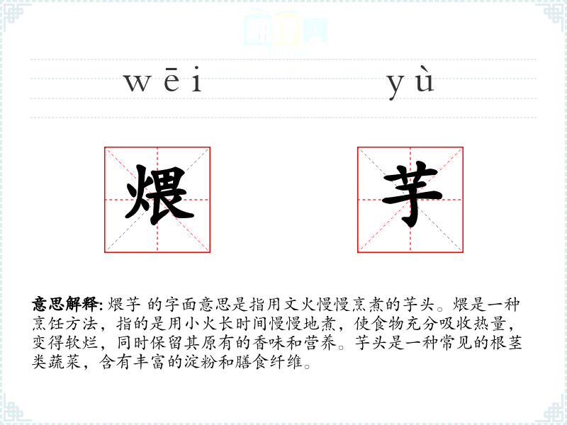 在文学作品中,“煨芋”可能被用来形容一种悠闲、缓慢的生活节奏,或者比喻某种需要耐心和时间的过程。在口语中,这个词可能更多地用于描述具体的烹饪活动。在专业烹饪领域,煨芋是一种特定的烹饪技巧,要求厨师掌握火候和时间。