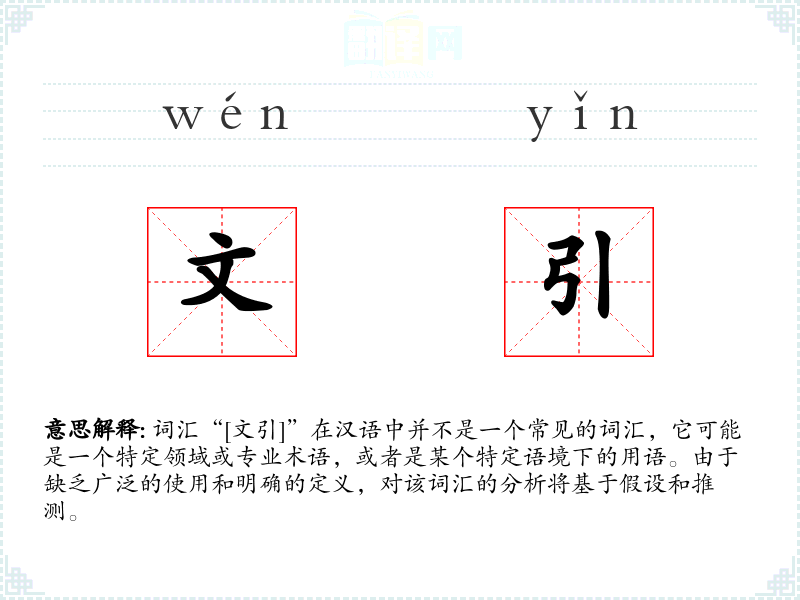 由于“[文引]”不是一个标准词汇,我们无法提供确切的基本定义。它可能是指“文学引用”或“文化引言”的缩写,或者是某个特定领域中的术语。