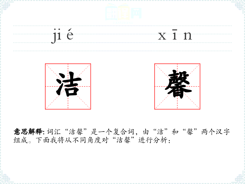 词汇“洁馨”是一个复合词,由“洁”和“馨”两个汉字组成。下面我将从不同角度对“洁馨”进行分析: