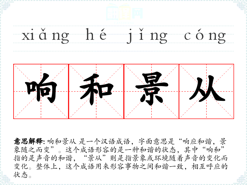 响和景从 这个成语不仅描述了一种和谐的状态,也体现了*人对和谐美学的追求。在语言学和表达中,理解和运用这样的成语可以丰富我们的表达方式,增强语言的文化内涵。