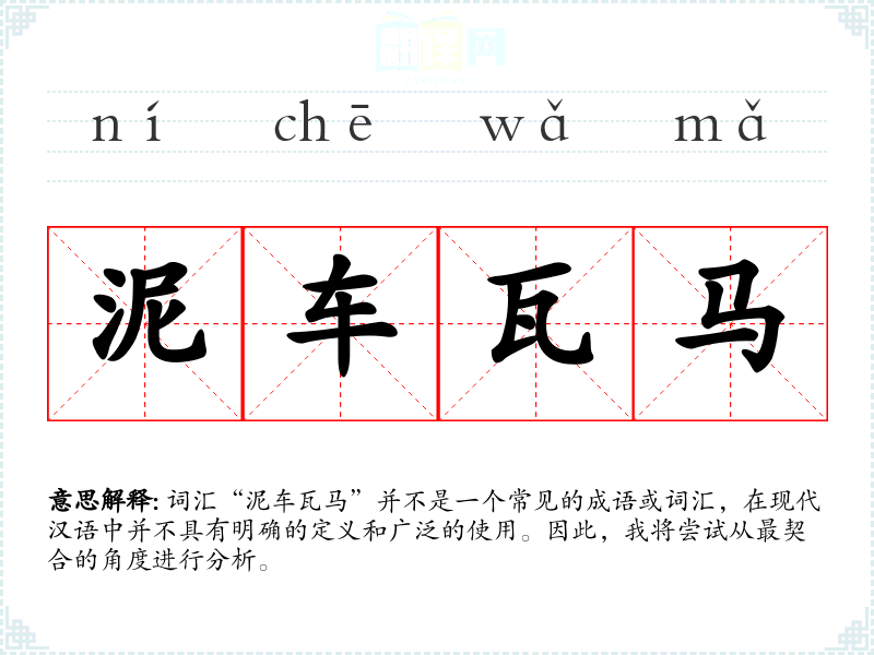 由于“泥车瓦马”不是一个标准的汉语词汇,我们无法给出其字面意思和基本含义。它可能是由“泥车”和“瓦马”两个词组合而成,但这样的组合在标准汉语中没有特定的意义。