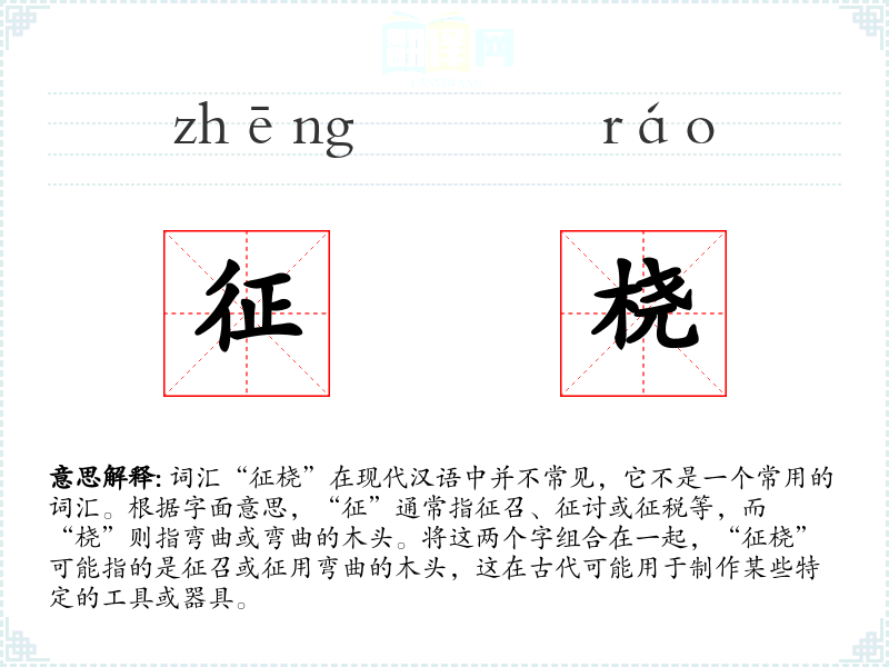 词汇“征桡”在现代汉语中并不常见,它不是一个常用的词汇。根据字面意思,“征”通常指征召、征讨或征税等,而“桡”则指弯曲或弯曲的木头。将这两个字组合在一起,“征桡”可能指的是征召或征用弯曲的木头,这在古代可能用于制作某些特定的工具或器具。