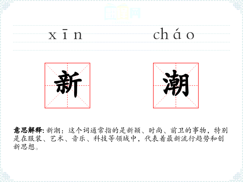 新潮:这个词通常指的是新颖、时尚、前卫的事物,特别是在服装、艺术、音乐、科技等领域中,代表着最新流行趋势和创新思想。