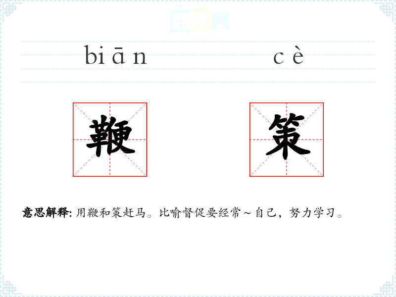 用鞭和策赶马。比喻督促要经常~自己,努力学习。