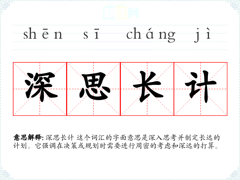 深思长计 这个词汇的字面意思是深入思考并制定长远的计划。它强调在决策或规划时需要进行周密的考虑和深远的打算。