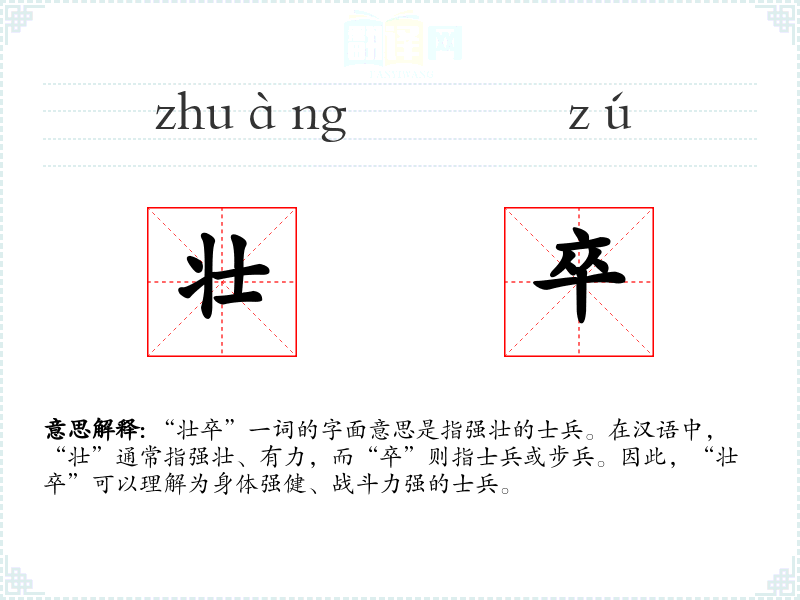 “壮卒”一词的字面意思是指强壮的士兵。在汉语中,“壮”通常指强壮、有力,而“卒”则指士兵或步兵。因此,“壮卒”可以理解为身体强健、战斗力强的士兵。