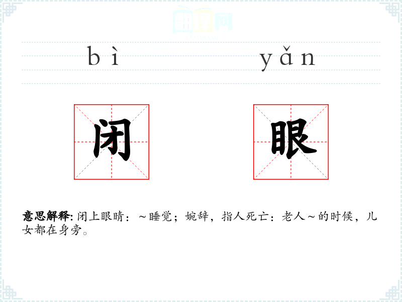 闭上眼睛:~睡觉;婉辞,指人死亡:老人~的时候,儿女都在身旁。