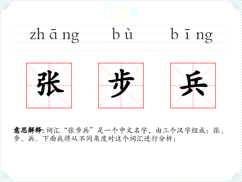 词汇“张步兵”是一个中文名字,由三个汉字组成:张、步、兵。下面我将从不同角度对这个词汇进行分析: