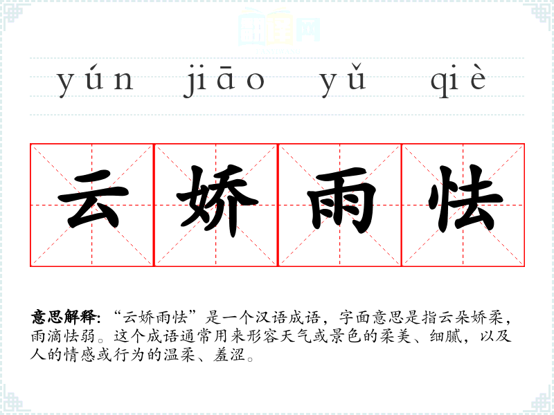 “云娇雨怯”这个成语的词源较为模糊,可能是由古代文人对自然景色的细腻观察和描绘中衍生出来的。随着时间的推移,这个成语逐渐被用来形容人的情感和行为,成为汉语中形容温柔、羞涩的一个常用词汇。
