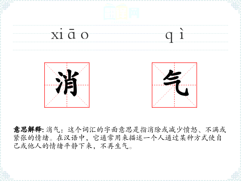 消气:这个词汇的字面意思是指消除或减少愤怒、不满或紧张的情绪。在汉语中,它通常用来描述一个人通过某种方式使自己或他人的情绪平静下来,不再生气。