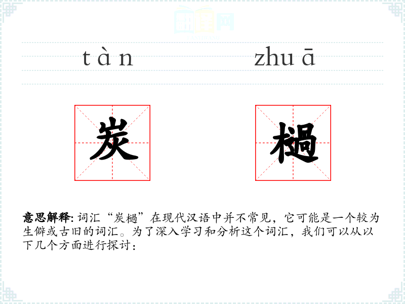 词汇“炭檛”在现代汉语中并不常见,它可能是一个较为生僻或古旧的词汇。为了深入学习和分析这个词汇,我们可以从以下几个方面进行探讨: