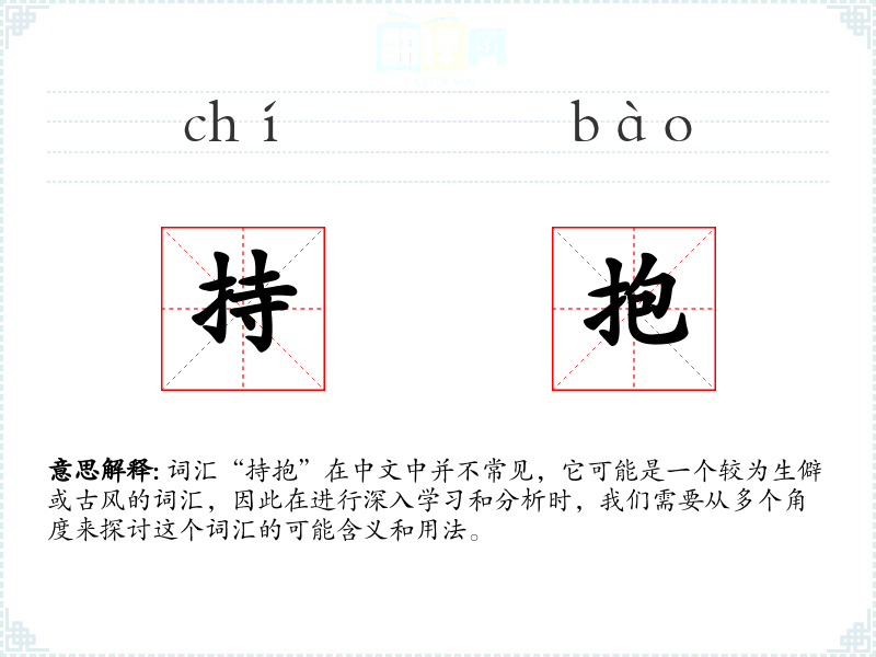 词汇“持抱”在中文中并不常见,它可能是一个较为生僻或古风的词汇,因此在进行深入学*和分析时,我们需要从多个角度来探讨这个词汇的可能含义和用法。