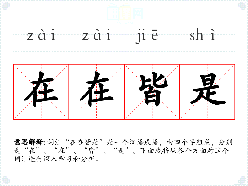 词汇“在在皆是”是一个汉语成语,由四个字组成,分别是“在”、“在”、“皆”、“是”。下面我将从各个方面对这个词汇进行深入学*和分析。